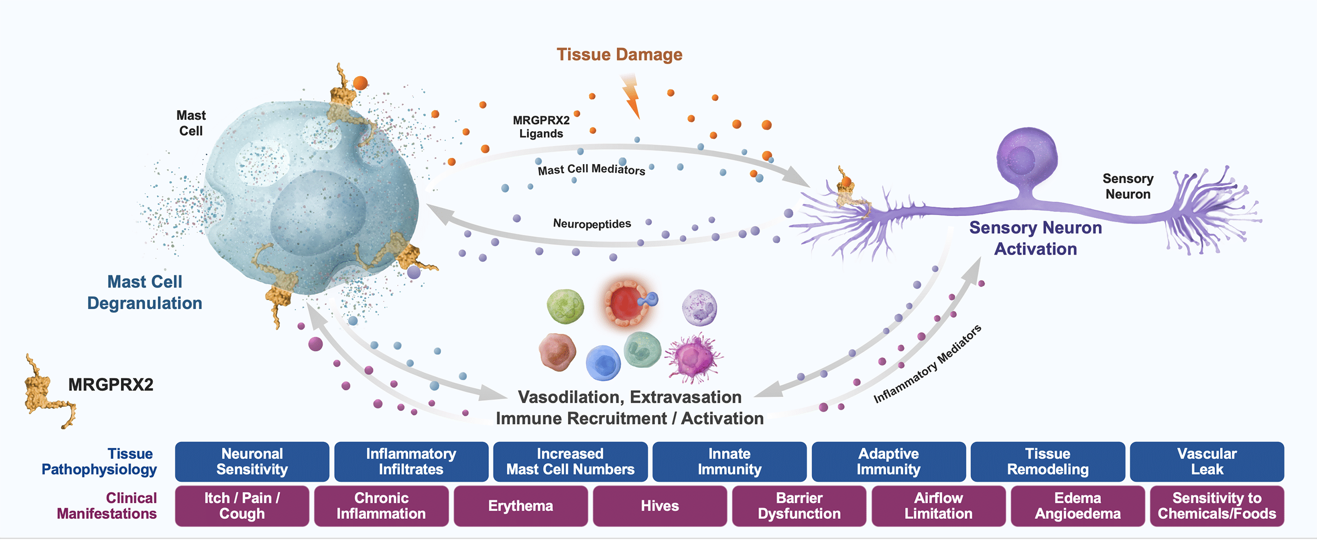 - Atopic Dermatitis (AD): Mast cells with MRGPRX2 positivity have been implicated in atopic dermatitis and are known to be in close proximity to peripheral sensory neurons, which also play a role in the itch associated with AD. AD has both an inflammatory component as well as upregulation of neurons creating itch, therefore targeting MRGPRX2 may play a significant role in the treatment of AD by targeting both aspects.